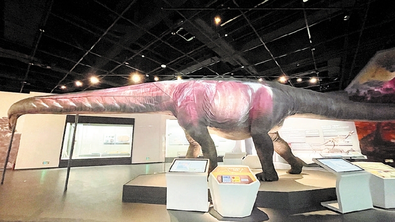 如果觉得这具“骨感”的化石还不足以让人想象出“亚洲最大恐龙”的全貌,那么旁边“探秘恐龙厅”里还有一个它的“肉身版”——尺寸相同的仿真复原恐龙。