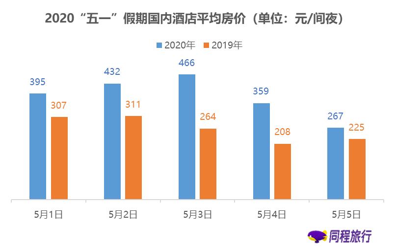 与去年同期相比,今年“五一”五天假期国内酒店(港澳台除外)的平均房价(最终预订价,非酒店前台价)均有不同幅度的上涨,整体的平均房价约为405元/间夜,平均上涨幅度约为42%。
