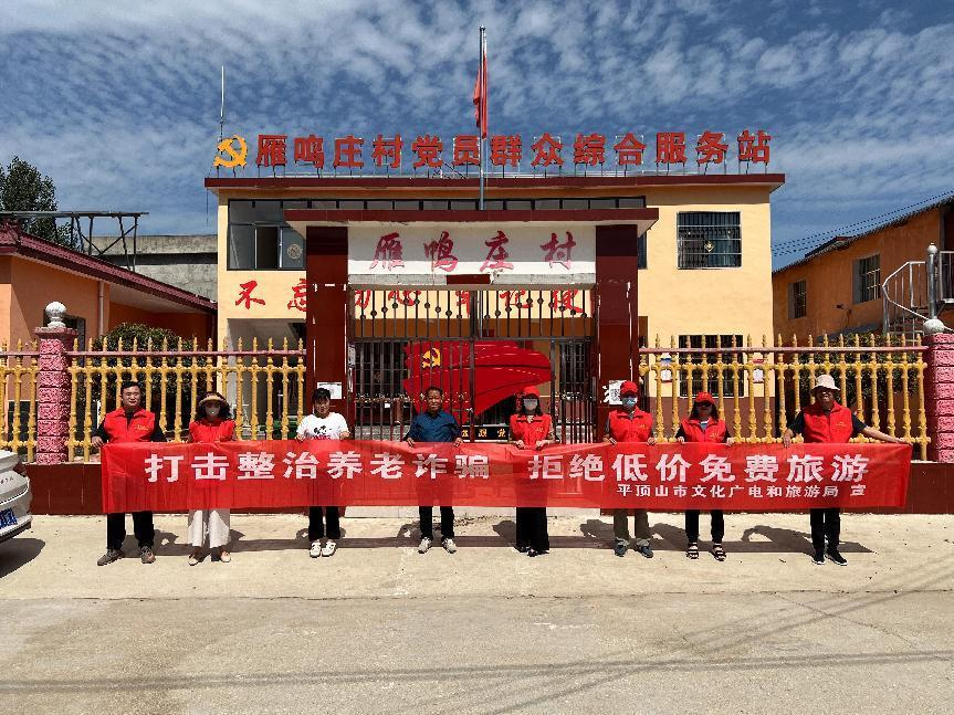 9月6日,平顶山市文化广电和旅游局工作人员来到鲁山县雁鸣庄村针对以“留守老人和空巢老人”为主要目标群体的免费旅游、购物送旅游、旅游赠礼品等名义或者以康养活动等形式招徕诱骗老年人的低价游等违法违规行为开展宣传工作。