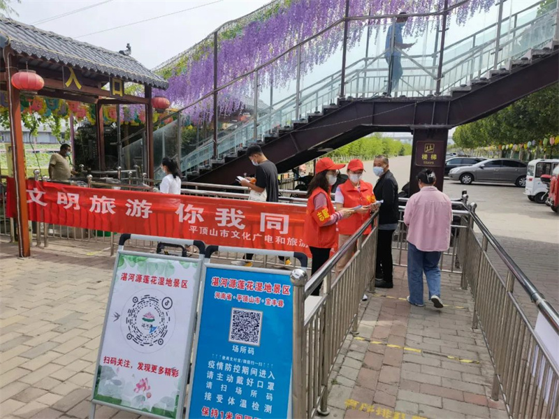 9月21日,平顶山市文化广电和旅游局工作人员来到宝丰县湛河源莲花湿地景区、小何生态园景区,开展“文明旅游、你我同行”宣传活动,进一步提升平顶山市居民文明素质和文明程度,深入推进文明城市创建工作。