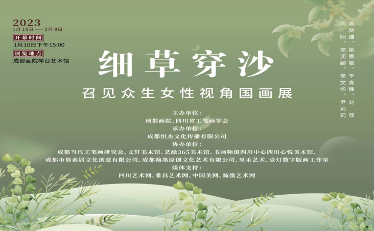 成都画院、四川省工笔画学会主办。本次展览将呈现成都画院专职画家、姚思敏、高晓笛、李青稞、向洋以及成都画院特聘画家刘萍、简沥郦、侯文华、尹莉莉这八位女性艺术家的精美作品,展览从女性视角出发,品味国画。