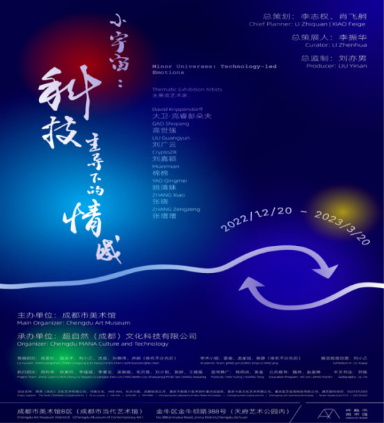 由成都市美术馆主办。“小宇宙”得益于漫画和青年文化的微小化、卡通化理解;“科技主导下的情感”,希望让技术和人的关系,更加拟人有亲和力。此次展览所选择的艺术家都在试图探索人和环境的关系,人和技术的关系,人和人的关系。