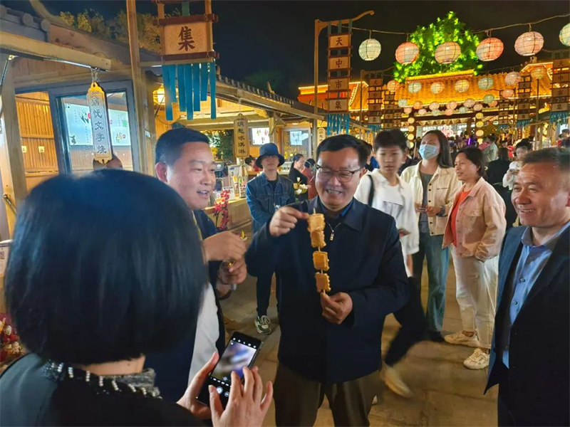 夜幕降临、华灯初上,嵩山脚下聚集着大批市民和从全国各地来登封打卡的游客,黄东升来到这里,实地察看天中市集夜经济发展情况,并对“夜游嵩山”相关业态运营工作给予肯定。