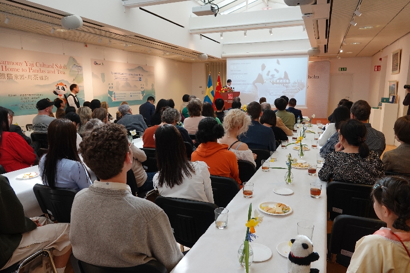 四川雅茶集团企业发言人介绍了雅安茶产业经济情况,并就雅茶集团种植基地、研发、生产、品牌、销售等情况作了详尽的推介。来自四川的团队现场表演了特色茶技茶艺--“龙行十八式”“天风十二品”、川剧变脸,并与瑞典朋友戏曲互动展示,全场嘉宾叫好不断。同期举办的“熊猫家园·川茶雅韵”图片展,通过近50幅照片展现四川自然景色、风土人情以及茶相关风俗文化。参加活动的嘉宾纷纷表示中国文化丰富多彩,四川的大熊猫萌趣可爱,有机会一定要去中国四川看熊猫、品川茶、尝美食。