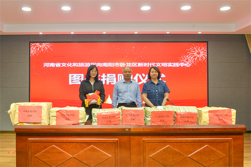 河南省图书馆副馆长刘杰向卧龙区新时代文明实践中心、蒲山镇政府捐赠图书,旨在丰富图书种类,提高广大市民阅读积极性,营造更加浓郁的学习氛围。
