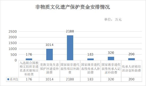 2022年资金安排入选联合国教科文组织非遗名录名册项目5个,羌族文化生态保护区建设单位9个,国家级非遗代表性项目52个,国家级非遗代表性传承人补助87人,国家级非遗代表性传承人记录名额8人,传承人研修培训计划5个班次。资金安排如下图所示: