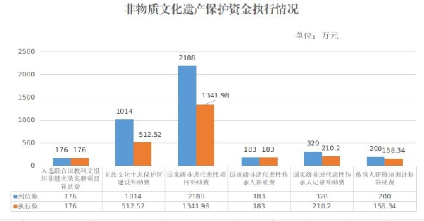 2022年国家非物质文化遗产保护资金4081万元,执行数2582.04万元,预算执行率63.27%。其中入选联合国教科文组织非遗名录名册项目补助176万元,执行数176万元,预算执行率100%;羌族文化生态保护区建设补助1014万元,执行数512.52万元,预算执行率50.54%;国家级非遗代表性项目补助2188万元,执行数1341.98万元,预算执行率63%;国家级非遗代表性传承人补助183万元,执行数183万元,预算执行率100%;国家级非遗代表性传承人记录补助320万元,执行数210.2万元,预算执行率66%;传承人研修培训计划补助200万元,执行数158.34万元,预算执行率79.17%。