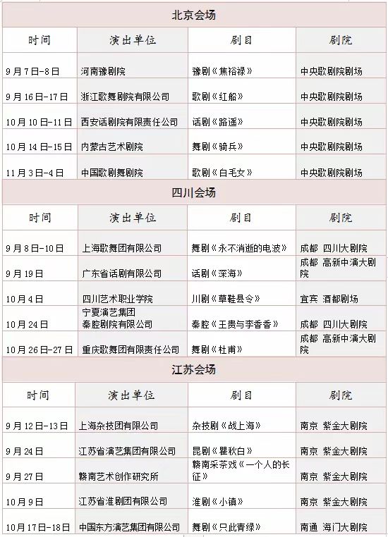 本次汇演剧目遴选自国家艺术基金2014—2023年度资助项目中获得过“五个一工程”优秀作品奖、“文华大奖”等奖项以及产生过广泛社会影响的15部优秀剧目(汇演安排附后),汇演活动将同期在北京市、江苏省、四川省三个省份举行。