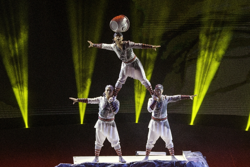 《太极·坛韵》采用水墨画作为演出背景,将太极文化与顶坛杂技表演相融合,“移形换位”“双坛后空翻上肩”“抖轿子上三节”等原创小坛技巧及高难度的大坛技巧“过缸口”,以不同节奏呈现小坛的灵活轻盈和大坛的沉稳厚重,形成了震撼的视觉冲击力,给观众带来了一场“惊、险、奇、美”的视觉盛宴,可谓惊心动魄,精彩的表演让观众惊叹不已、掌声连连。