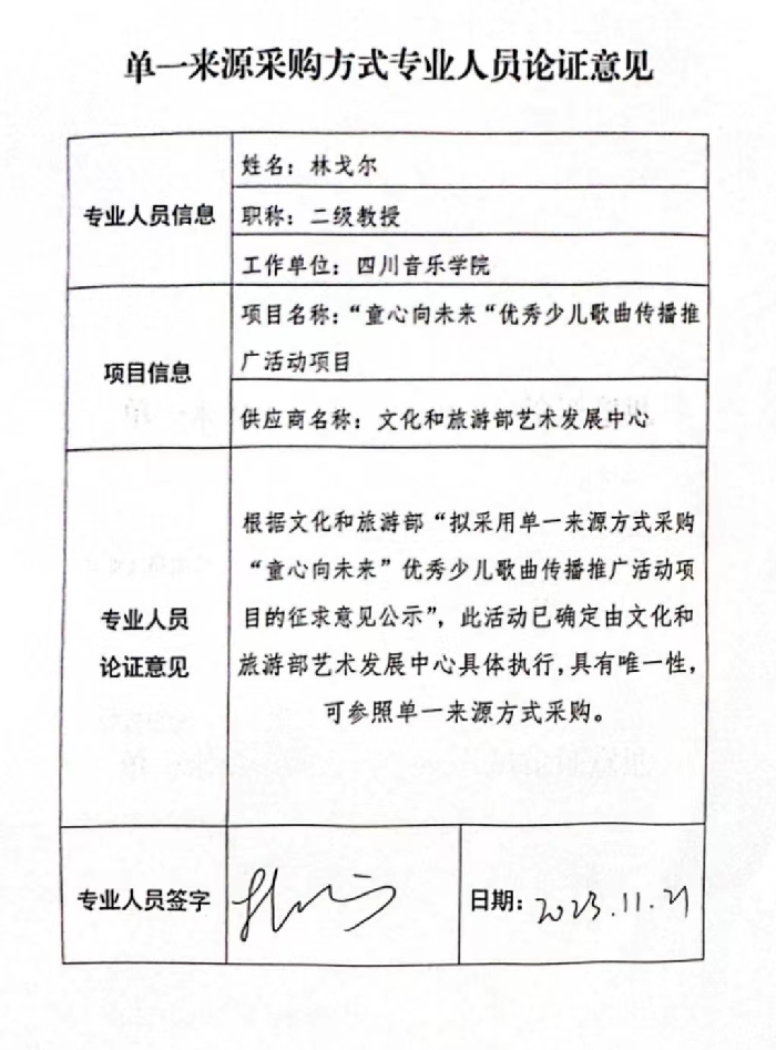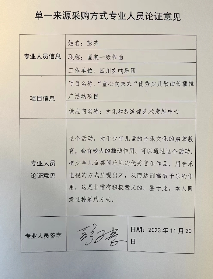 为进一步丰富少年儿童精神文化生活,促进少年儿童综合素质全面提高和身心健康成长,文化和旅游部举办了“童心向未来——当代少儿歌曲创作推广活动”。为进一步扩大这批优秀歌曲的社会影响力,文化和旅游部艺术司、文化和旅游部艺术发展中心将联合四川省文化和旅游厅等单位将精选的16首少儿歌曲制作成音乐电视片,并进行传唱、传播。现拟采用单一来源方式采购“童心向未来”优秀少儿歌曲传播推广活动项目,并就此事项向潜在供应商、单位及个人广泛征求意见:
