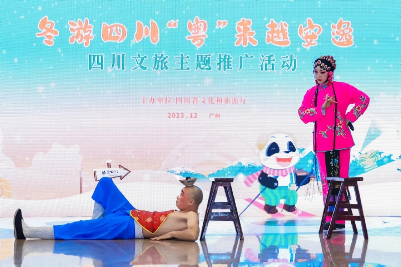 推介会围绕“冬季来四川找安逸”为主题,分为蜀山冰雪好安逸、冬日温泉乐安逸、川粤往来真安逸三个篇章分别就自身特色冬季旅游产品进行了推介,邀请广大游客到甘孜州雅江县、巴中市、广安市、雅安市等地赏蜀山冰雪,到凉山州、宜宾市和乐山市享冬日温泉,到德阳市和南充市感受三星堆文化和三国文化的历史沉淀,在观雪景、品美食、滑雪中感受四川冬日的热情和温暖。活动现场,民族服饰展《康巴汉子走秀》、魔术《飞花令·伞》、茶艺《龙行十八式》、《川剧变脸》《皮金滚灯》、《年画村里幸福歌》等节目精彩呈现,丰富的舞台元素、多样化的现场表达,获得了与会领导嘉宾及线上观众的一致认可。