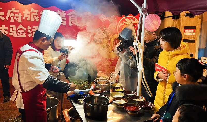 为大力弘扬和传承川菜技艺与文化,2月3日晚,由四川省文化和旅游厅主办,峨眉山市人民政府、四川省非物质文化遗产保护中心及21个市州文化和旅游局承办的“安逸四川 非遗过大年”——“品天府旅游美食·享非遗年味”活动在乐山市峨眉山市马路桥美食街启动。活动现场,来自网络征集的游客、市民、非遗传承人、各行业代表团等数百人现场品鉴天府旅游美食,寻找记忆中的非遗年味。