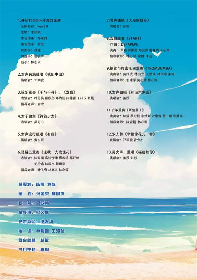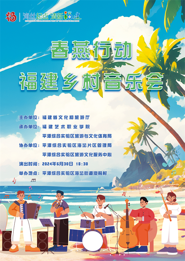 此次音乐会走进平潭活动由福建省文化和旅游厅主办,福建艺术职业学院、平潭综合实验区旅游与文化体育局承办,平潭综合实验区海坛片区管理局、平潭综合实验区旅游文化服务中心协办。将于2024年6月30日18:30在平潭综合实验区海坛街道澳前村进行。