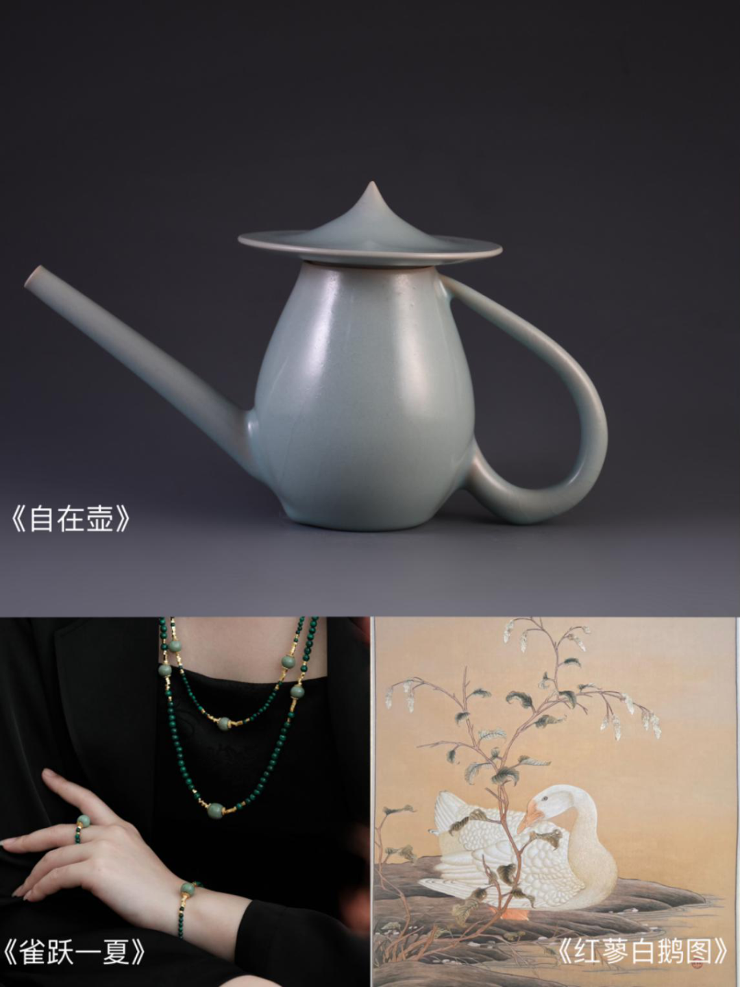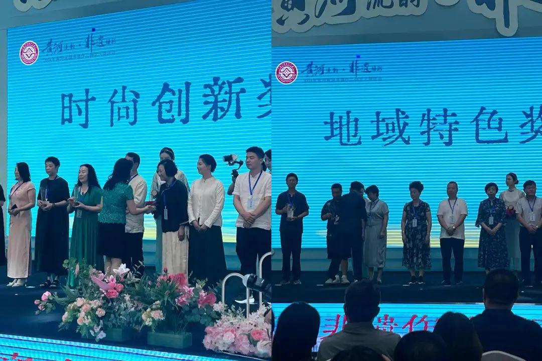 最终经过组委会评选,汝瓷烧制技艺代表性传承人王振芳的作品《自在壶》和张义萌的作品《雀悦一夏》获得时尚创新奖,汴绣代表性传承人程曼平的作品《红蓼白鹅图》获得地域特色奖。