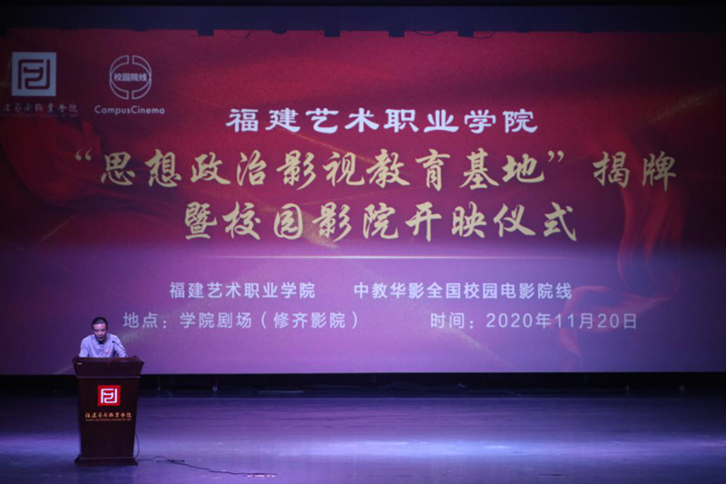 2020年11月20日晚18时,福建艺术职业学院·中教华影全国校园电影院线思想政治影视教育基地揭牌仪式暨修齐影院开映观影活动在福建艺术职业学院剧场隆重举行。校领导詹秉辉,党委宣传部、团委、实践教学部、学生工作处等相关部门负责人,系党支部书记,团总支书记、辅导员以及学生代表300余人参加了活动。