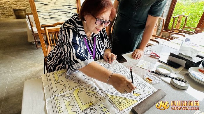 在六合染房内,塔吉克斯坦“阿维斯塔”通讯社总编辑占纳特洪·库尔班诺娃正沉浸式体验中国传统“蜀绘”技艺,在“蜀绘”老师的指导下,每一个精细的动作都让她感到新奇不已。“丝绸上作画真的太美了。”