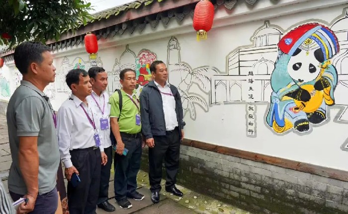 在这里,非遗文化融入烟火生活。画中有人,人在画中,老挝国家通讯社副社长威莱·玛尼拉不由感慨:“这里的氛围很好,每幅画都很有寓意。街边的老人有的在休息,有的在玩牌,很有氛围。”