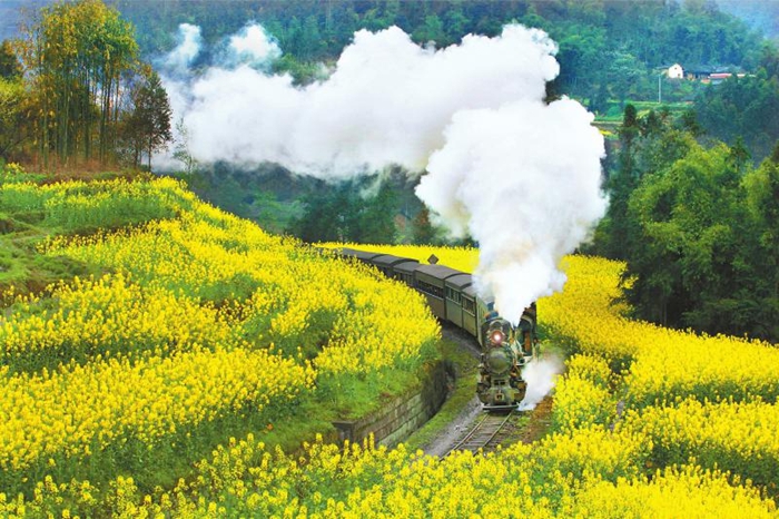 乐山市犍为县嘉阳小火车穿梭在油菜花里。(乐山市文广旅局供图)